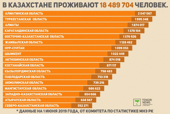 В Казахстане проживают 18 489 704 человека. По численности населения лидирует Алматинская область - 2 047 067 жителей. Меньше всего людей в Северо-Казахстанской области - 552 271 человек.