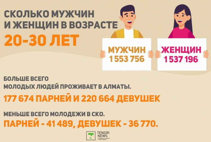 В возрасте 20-30 лет в Казахстане преобладает мужское население. Юношей на 16 560 больше, чем девушек. В Алматы проживает больше всего молодежи. Всего в Казахстане 3 090 952 человека в возрасте 20-30 лет.