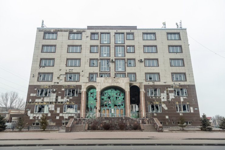 А это здание городского акимата. Погромщики захватили его 5 января, а затем подожгли. Все, что было внутри, полностью сгорело.