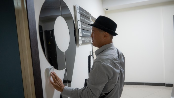 Кенжегул Сейтжан, он видит только силуэты, передвигается с помощью палочки, на интервью он приехал на социальном такси. Предприниматель, в 2017 году он открыл по франшизе хостел, который принимает ежемесячно 1500 человек.