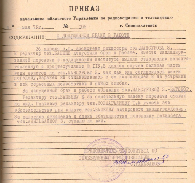 В архиве сохранились приказы, в которых можно узнать, за что сотрудники телевидения могли получить похвалу, а за что выговор.