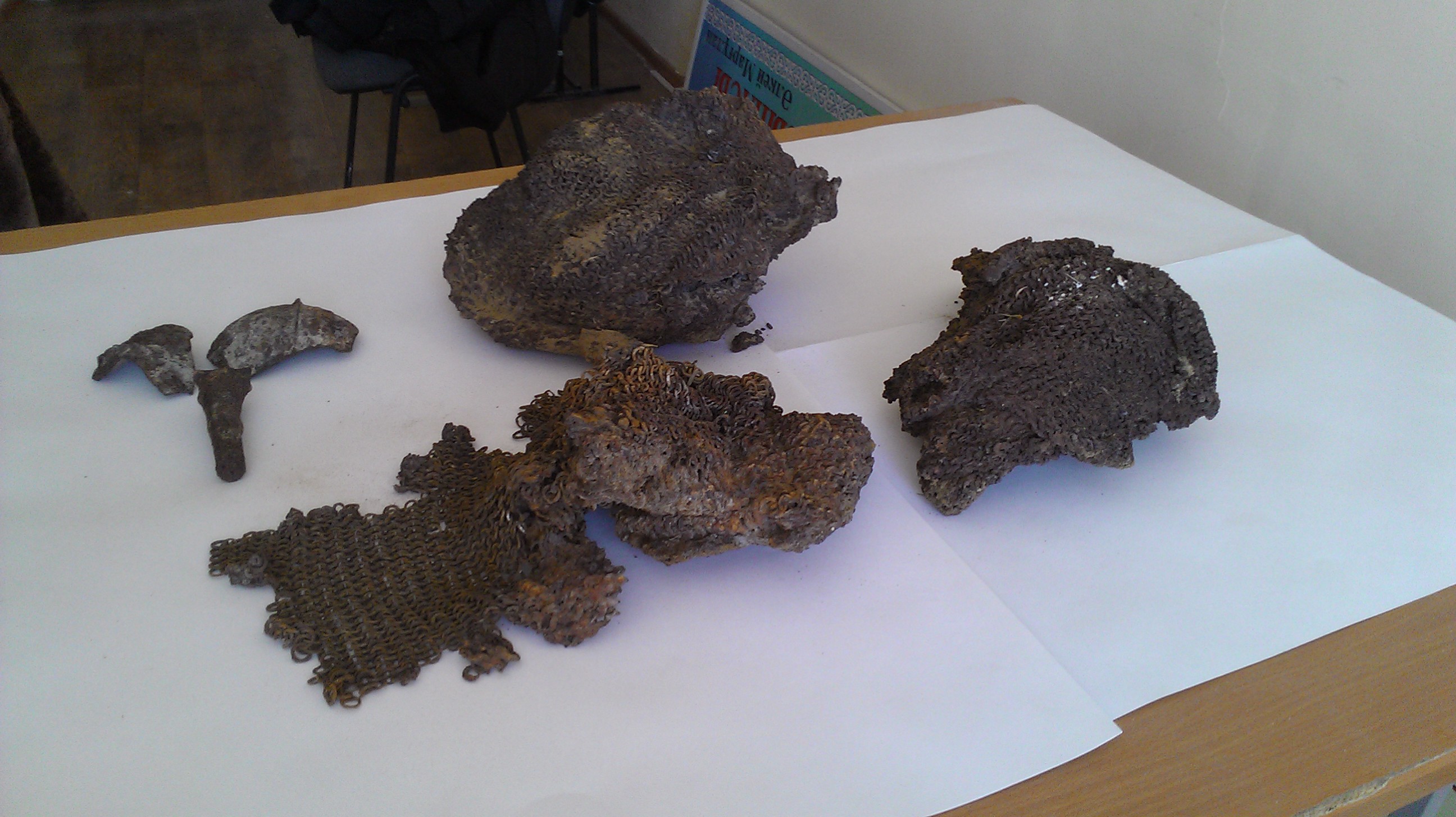 - Да, это просто удивительно. Мы когда приехали на место, были в шоке. Две кольчуги лежали так, будто их аккуратно сняли и положили, как мы одежду аккуратно складываем. Здесь же рядом лежали части разбитого шлема. Правда, сначала мы трактовали его как ковш, а потом когда собрали кусочки воедино, увидели, что это шлем. Здесь же лежала плечевая накидка, которая обычно идет под шлемом. Получается, мы имеем полный комплект боевого защитного снаряжения казахского батыра.