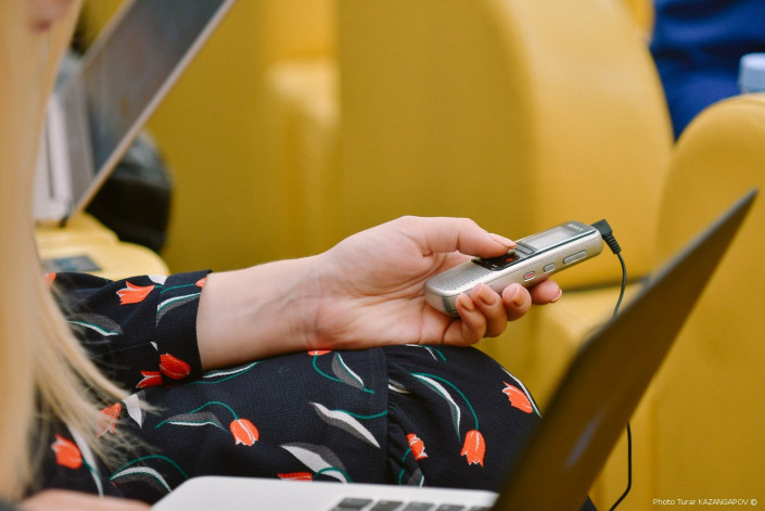 В этом зале сидят журналисты, они ждут, пока на экране начнется трансляция встречи двух президентов.
