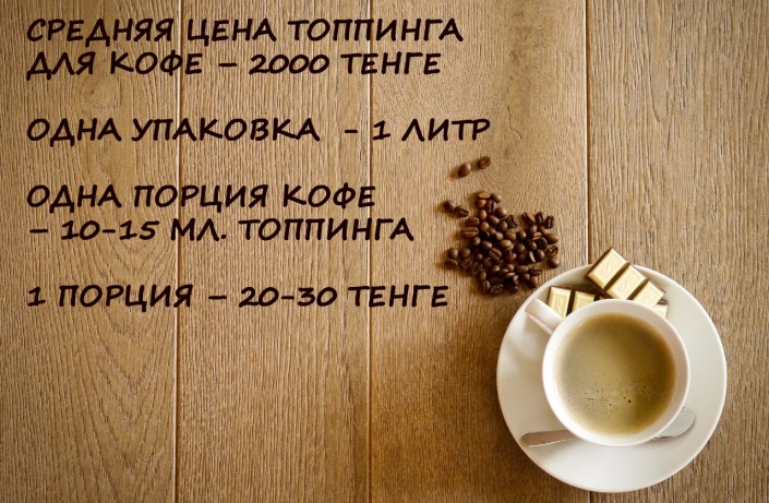 Также есть такой пункт расходов, как сиропы и топпинги. "Есть французские топпинги, есть российские. Сироп российского производства в среднем – 2 000 тенге. За сироп клиенты в кофейнях доплачивают в среднем 100-200 тенге, некоторые предлагают бесплатно, но там уже, возможно, цена сидит в стоимости кофе. На одну порцию уходит 10-15 миллилитров, то есть одна литровая бутылка сиропа -  это от 70 до 100 порций", - поясняет собеседник.