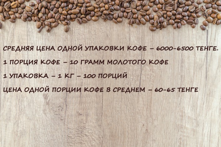 "В Интернете пишут, что семь граммов хватит на одну 350-миллиметровую чашку и с таким расходом может хватит на 130 порций. На практике это не так. Бариста может рассыпать, или еще что-нибудь. В супермаркетах продают дешевый кофе, от 3 000 тенге. Его покупать вообще не рекомендуем.  Мы реализуем в среднем по 6 000-6 500 тенге за упаковку. Есть и за 8 000, 8 500, 9 000, максимальная цена - 9 500 тенге.  Одной упаковки вам хватит в среднем на 100 порций  из расчета одна чашка - 10 грамм", - говорит Саят.
