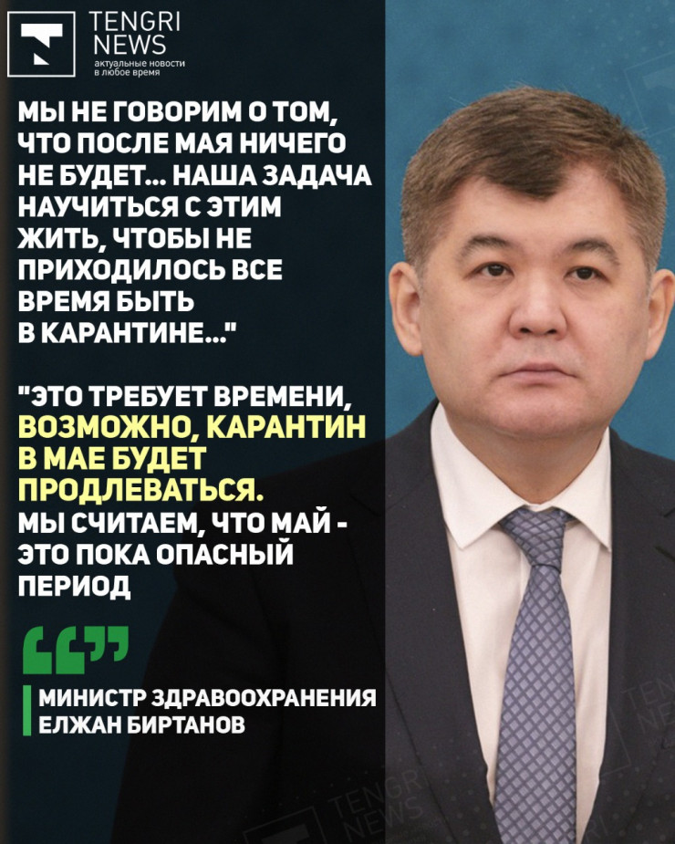 Мы сможем перезапустить экономику, это задача, которая перед правительством стоит. До конца мая, мы уверены, мы будем контролировать ситуацию в полном объеме, чтобы говорить о каком-то более-менее серьезном смягчении карантина. Но пока надо потерпеть, соблюдать все те же принципы. Инфекция передается через контакт. Это очень сложно, но все же хотел бы еще раз призвать проявлять благоразумие, ограничивать контакты, находиться дома", - обратился к казахстанцам Елжан Биртанов.