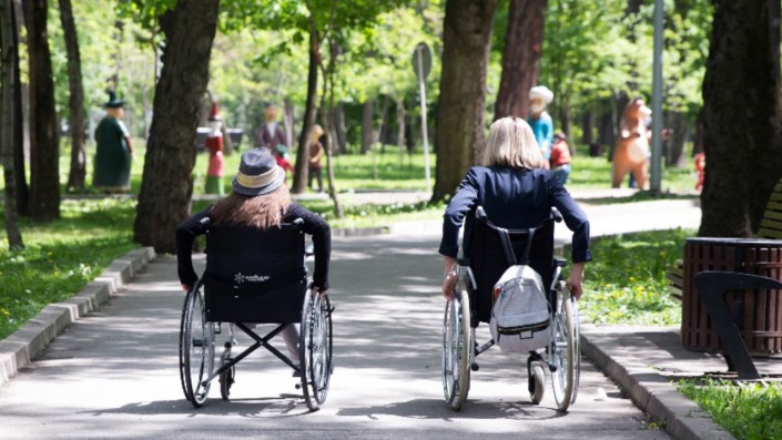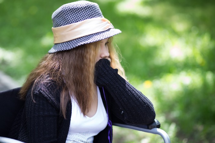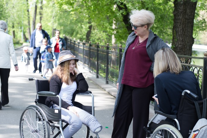 По пути к парковому озеру Катя большая ловко управляется с 18-килограммовым инвалидным креслом, оно все в ярких наклейках, дочка постаралась. Катя маленькая крутит колеса медленно. Они молчат.