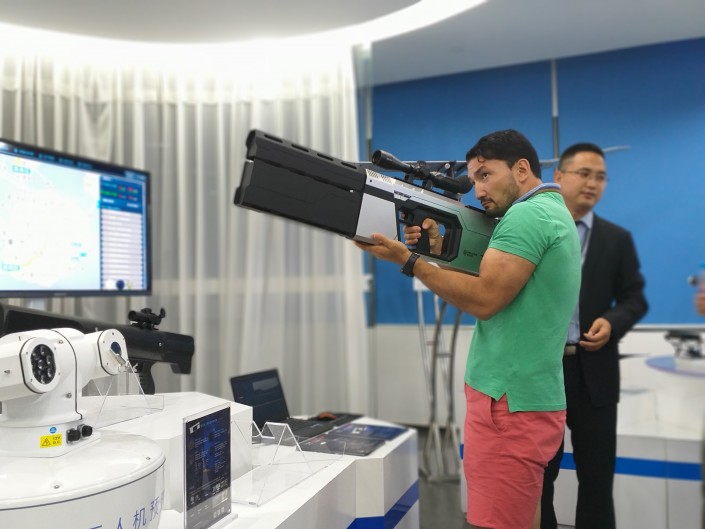 И хотя это устройство и выглядит внешне как оружие, оно ничем не стреляет, а просто блокирует связь дрона. "Это уже третье поколение антидрона, в него встроен радар, чтобы обнаружить дрон. Потому что сейчас дроны сильно угрожают общественной безопасности, ведь для них высокие стены и заборы уже ничего не значат", - говорит Антон и отмечает, что дальность действия устройства составляет 500-600 метров.