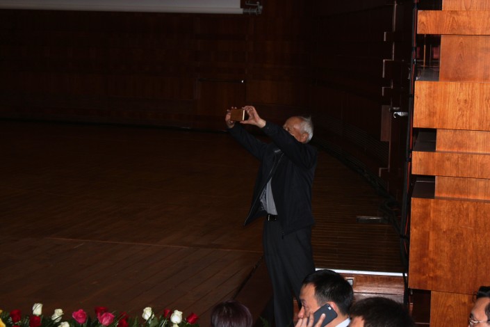 Так вот этот старец каким-то непонятным образом оказался отрезанным от круга, с которым общался Президент после показа. Го Цзюлун сначала вместе с сопровождавшей его супругой, у которой был букет, попытался подойти как можно ближе, но это им не удалось. В результате этот человек скромно встал на край сцены, чтобы снять Президента на свой смартфон.