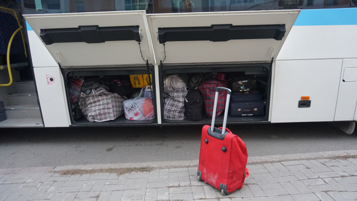 Подъехал автобус, багажное отделение заполняется чемоданами и сумками.