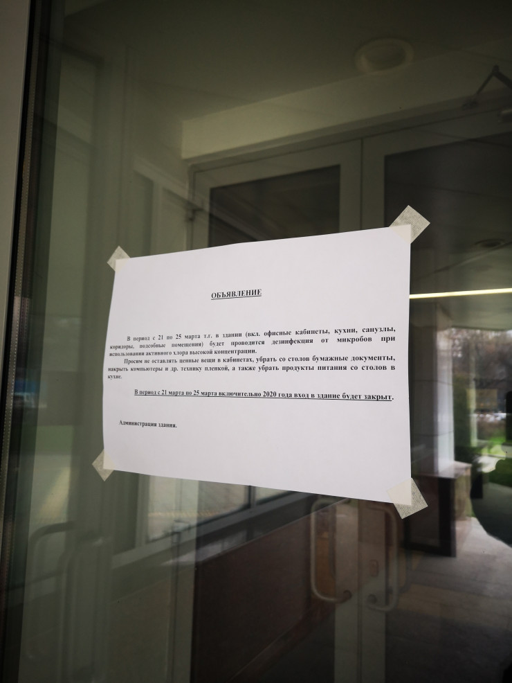 "Просим не оставлять ценные вещи в кабинетах, убрать со столов бумажные документы, накрыть компьютеры и другую технику пленкой", - говорится в объявлении.