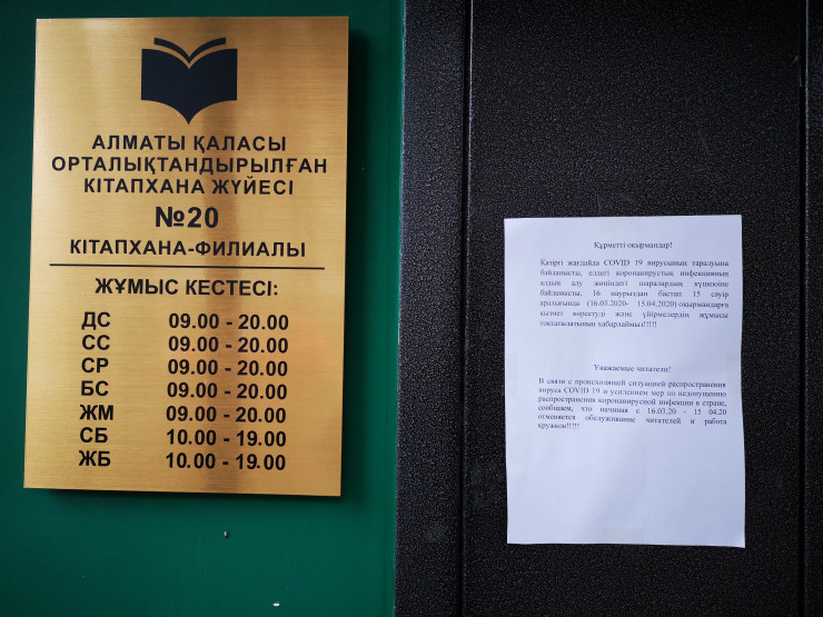 В одном из зданий напротив городского акимата висит объявление о том, что на протяжении нескольких дней будет проводиться дезинфекция с использованием активного хлора высокой концентрации.