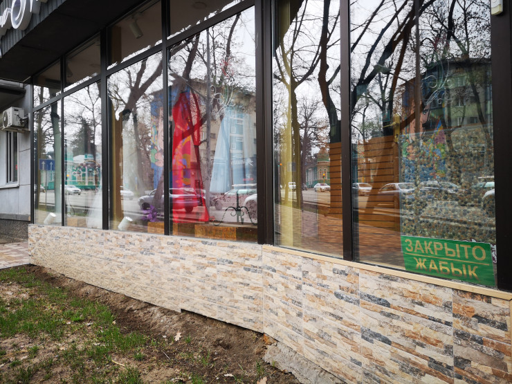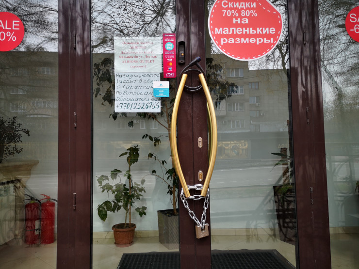 На входе обращение к покупателям: "Распоряжение акимата. В магазин запускается не более пяти человек. Просим понять и войти в положение исходя из сложившейся ситуации в городе Алматы".