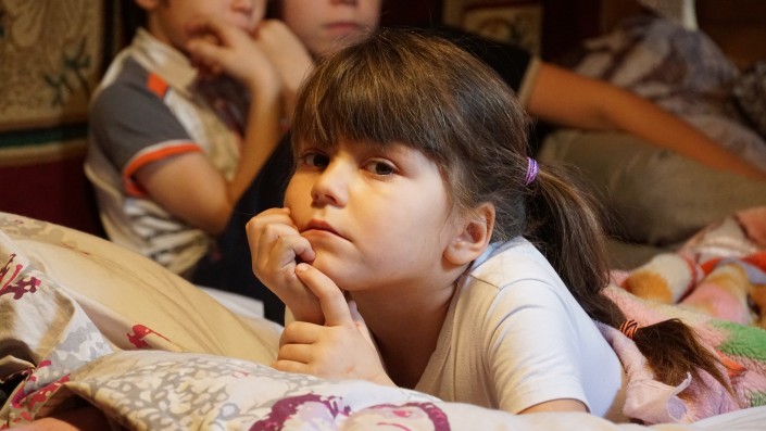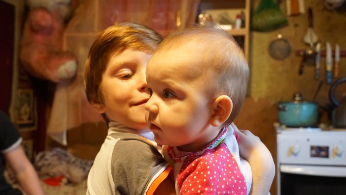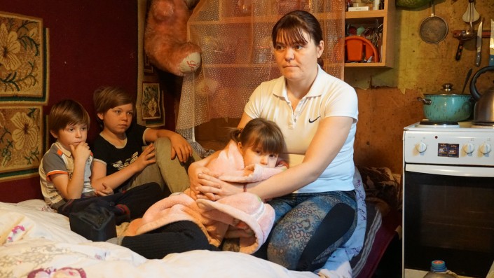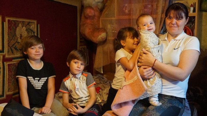 В соседней спаленке в этот момент просыпается самый младший ребенок в семье. Мать берет девочку на руки. Другие дети переключают внимание с телевизора на сестренку.