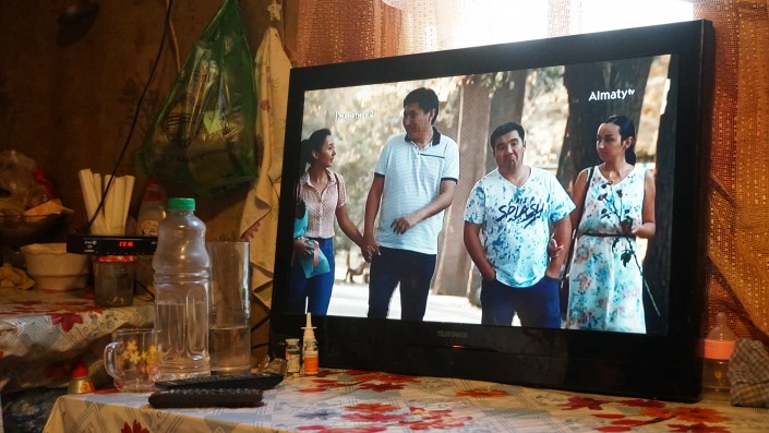 Вся семья жмется друг к дружке, сидя на кровати. Из телевизора доносится песня: "Мариям Жагор деген орыс қызы...".