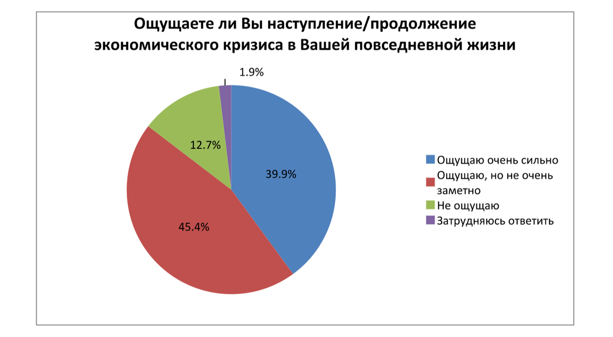 Не ощутили экономический кризис в своей повседневной жизни менее 13 процентов респондентов. 45 процентов ощутили его не очень заметно, но около 40 процентов - очень сильно.