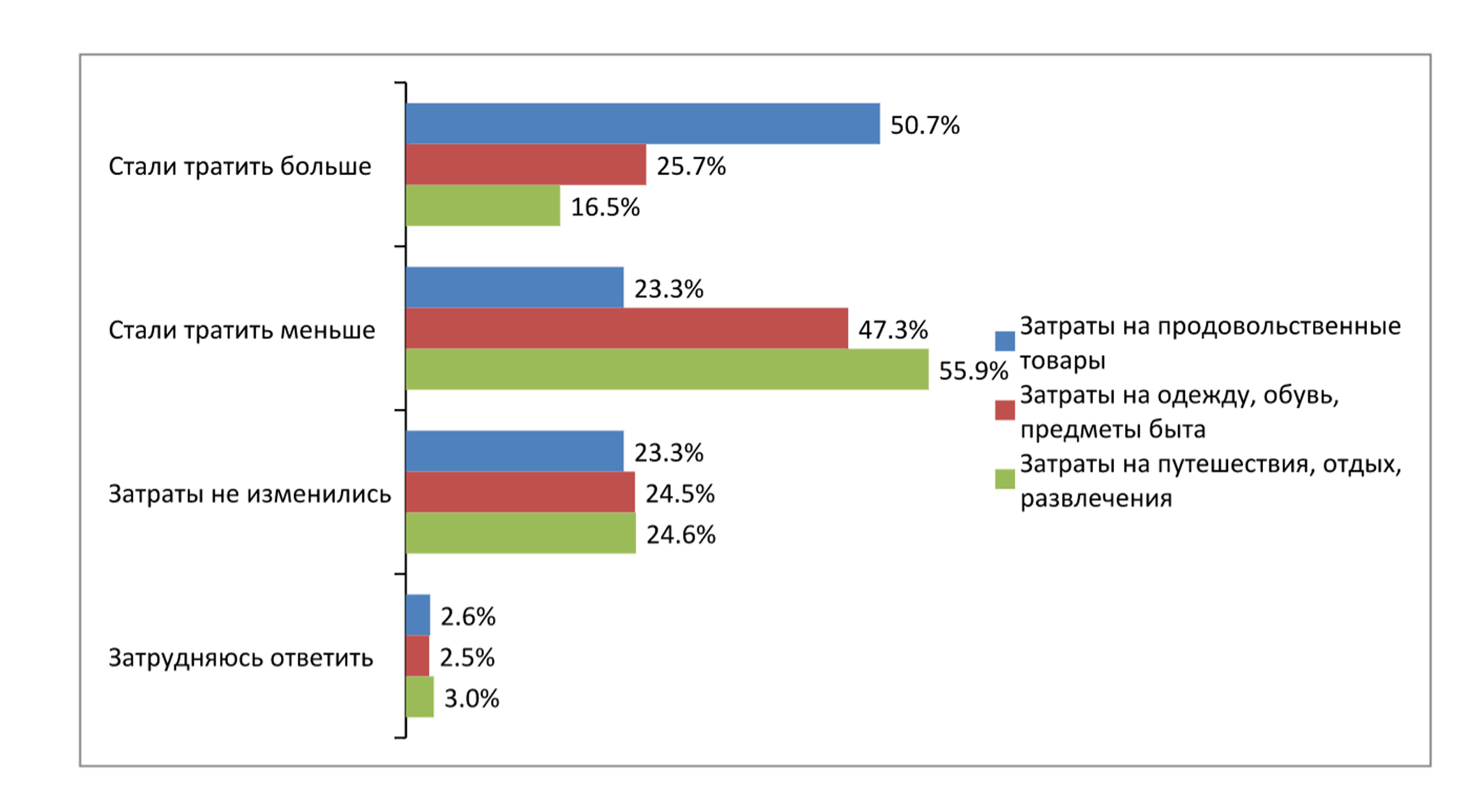 Реакция на кризис проявилась, прежде всего, в структуре семейных бюджетов. Более 50 процентов опрошенных стали тратить больше на продовольственные товары, при том, что 47 процентов семей  сократили затраты на одежду, обувь, предметы быта, а 56 процентов уменьшили расходы на путешествия, отдых, развлечения.