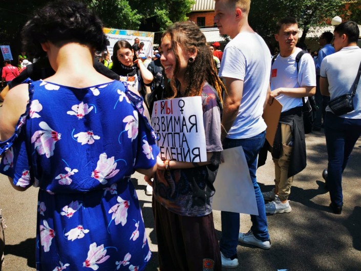 Соңғы сән үлгісінде киінген жастар еркіндікті бейнелейтіндей, демократияны іші де, сырты да сүйетіні анық көрінеді. "Мы уязвимая группа населения" - үнқағазындағы сөз әдеттегі "АЭС салынбасын", "Біз әділ митинг үшін", "Қазір болмаса қашан" деген жауыр сөзден ерекше, озық, айтары салмақтырақ болып көрінді.