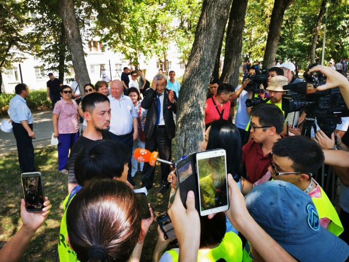 Суретте митингіні өткізуге әкімдіктен рұқсат алған Әлнұр Ілияшев журналистердің сұрағына жауап беріп тұр. Белсенді митинг барысында мінберге шыққандардың регламентін бақылап, ұйымдастыру барысын толығымен өз мойнына алған.