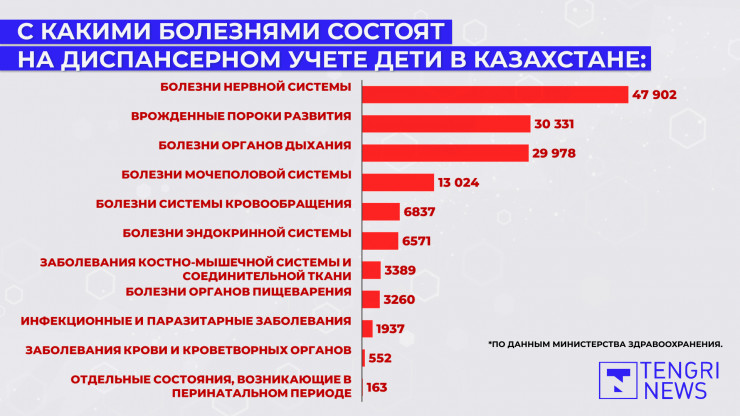 По данным Министерства здравоохранения, больше всего казахстанских детей состоит на учете по болезням нервной системы, врожденным порокам развития, а также болезням органов дыхания.