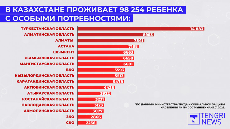В Казахстане проживает 98 254 ребенка с особыми потребностями. В стране функционирует 49 реабилитационных центров, оказывающих помощь. Из них 3 центра на республиканском уровне: Национальный центр детской реабилитации КФ UMC с филиалом в Кызылорде, Республиканский детский реабилитационный центр "Балбулак", Республиканский центр реабилитации "Бурабай" и 46 центров на региональном уровне: