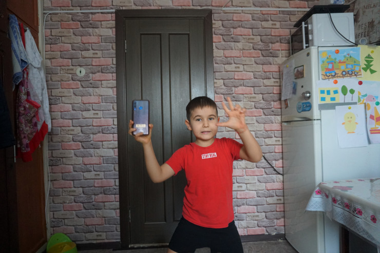 Всю нашу беседу Тимур не сидел ни минуты. Он постоянно что-то делал, пытался куда-то залезть. Набегавшись, насколько это возможно сделать на 13 квадратных метрах, он взял в руки телефон и немного успокоился.