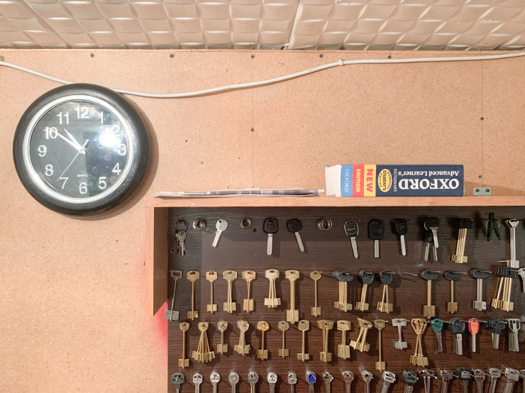Когда заходишь в его мастерскую, то словно попадаешь в знаменитые японские магазинчики комбини - небольшие, но крайне уютные торговые лавки, где удивительным образом помещается самый необходимый товар. Так и у Жанболата Мусайбекова - рационально использован каждый сантиметр подвального помещения: основа всего - это, конечно же, рабочее пространство с аккуратно расставленными инструментами (наш герой очень любит порядок), две картины, на двери лист с ценами на услуги; чуть ниже - шторка, за ней - комнатка, где отдыхает мастер; а в коридоре - свободная библиотека, Жанболат организовал полку с книгами, чтобы люди больше читали.