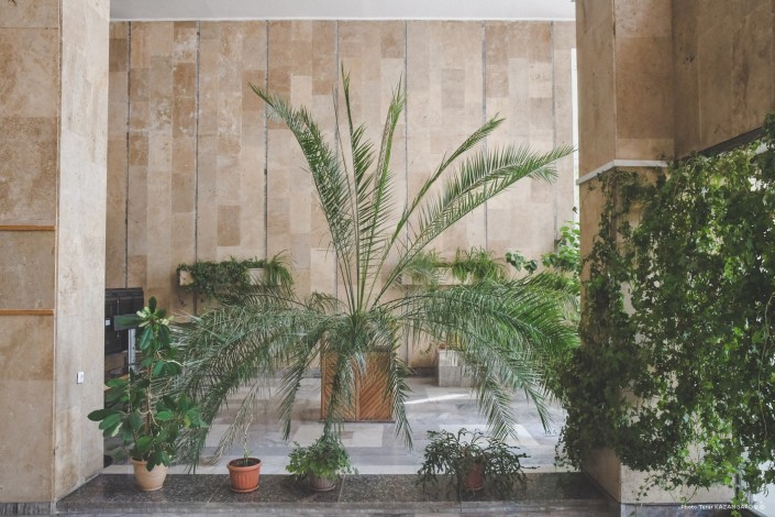 Просторный светлый холл со стеклянными дверьми в массивной металлической оправе. Повсюду горшки с цветами.