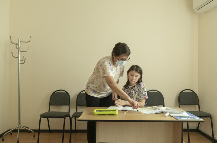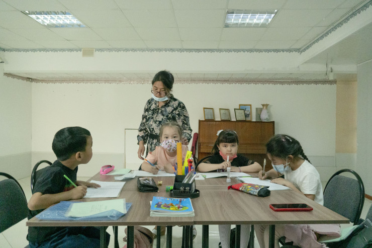 На цокольном этаже одной из типовых пятиэтажек расположен образовательный центр. Руководит им Улжан Мырзагелдиева - в прошлом учитель казахского языка, а ныне социальный предприниматель и учредитель фонда "Сильных мам". Улжан в одиночку воспитывает четверых детей. На вопрос, как же так получилось, она спокойно отвечает: такова судьба.