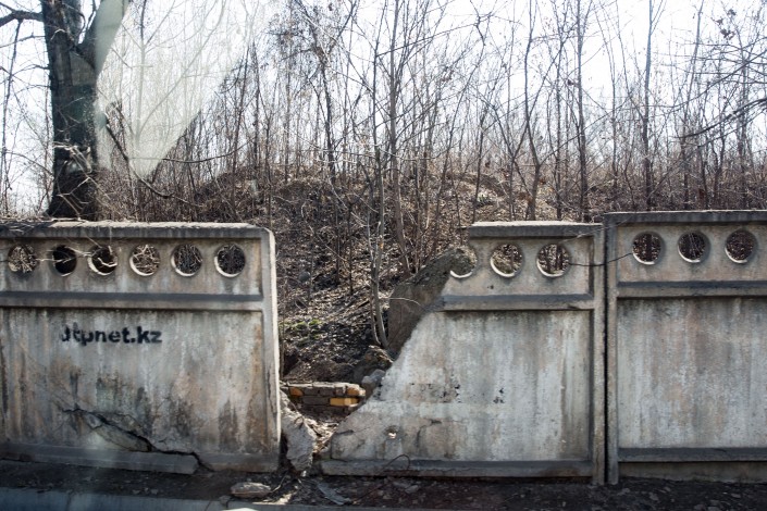 За этим забором, который стоит по улице Татибекова, находится земляной вал вдоль реки Малая Алматинка, с которого и началось в 1854 году укрепление Верное. Гиды пробовали пройти за забор, но их не пустили. Им лишь удалось узнать, что часть этой территории отдана под склады. Поэтому экскурсионный автобус, чтобы люди успели заглянуть за забор, очень медленно проезжает вдоль него.