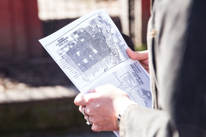 Гостям раздают распечатку с планом Верного, составленным землемером Поповым в 1912 году. Свое название (почти) сохранила только одна улица - Гоголевская, сейчас это улица Гоголя. Интересно, как улицам давали имена: известно, что на улице Учительской стояли бараки для приглашенных в город учителей. Улица Торговая - это современная Жибек Жолы, где по-прежнему много магазинов. А улица Мещанская (сейчас Богенбай батыра) - по-прежнему очень престижный адрес для проживания.