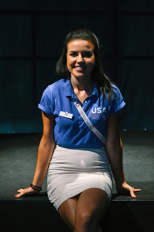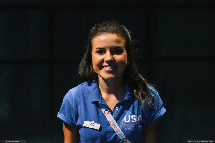 "Меня зовут Анна, и я одна из 40 американских студентов, которые работают здесь в павильоне США", - говорит всем входящим девушка, которая приехала из Южной Каролины.
