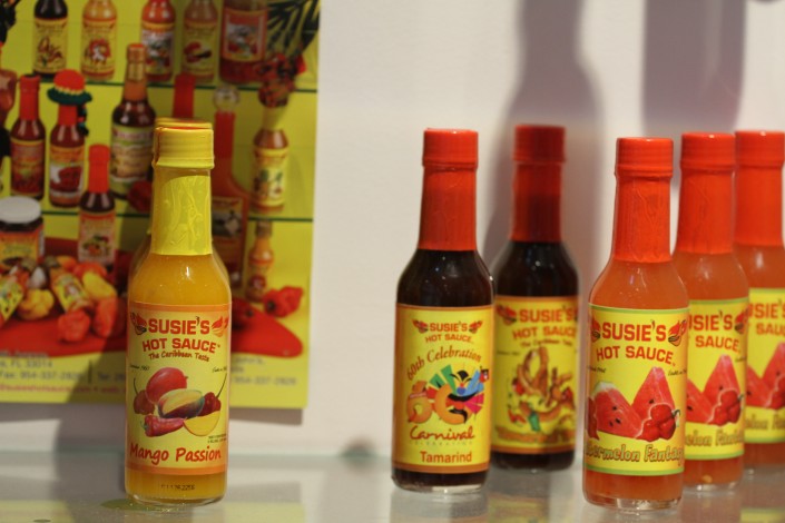 "А самый острый соус называется "Скорпион", - говорит жительница государства Антигуа и Барбуда, показывая на бутылочки, расставленные на полке в карибском павильоне.