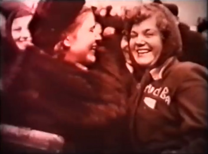Старая кинохроника. Люди получают комсомольские путевки и едут на целину.