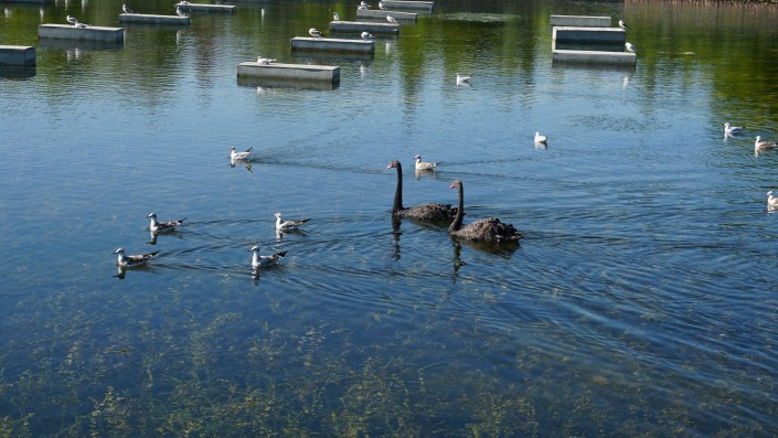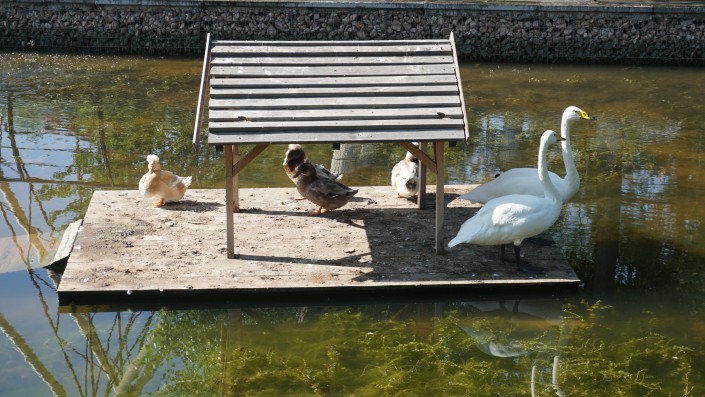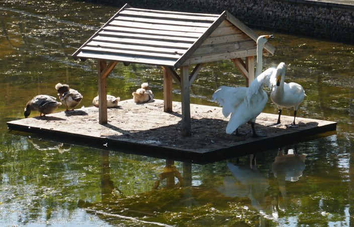 Посередине пруда лебедь-одиночка свернулся калачиком и спал. Он был на своей нейтральной территории - между парой белых и черных лебедей. В парке наступил тихий час. Говорят, продлится он до после обеда, а к вечеру лебеди снова начнут активничать.