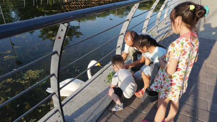 Подошли еще люди. Дети принялись тоже кормить лебедя. Он и не думал никуда уплывать от них.