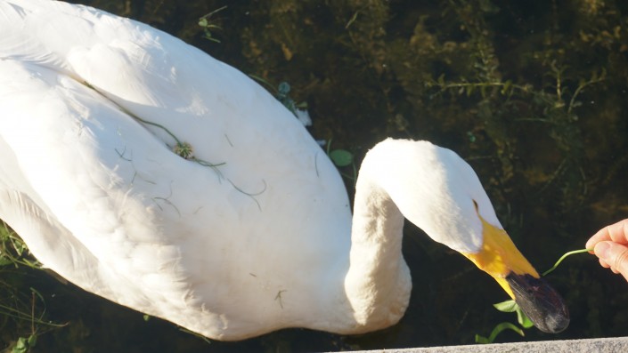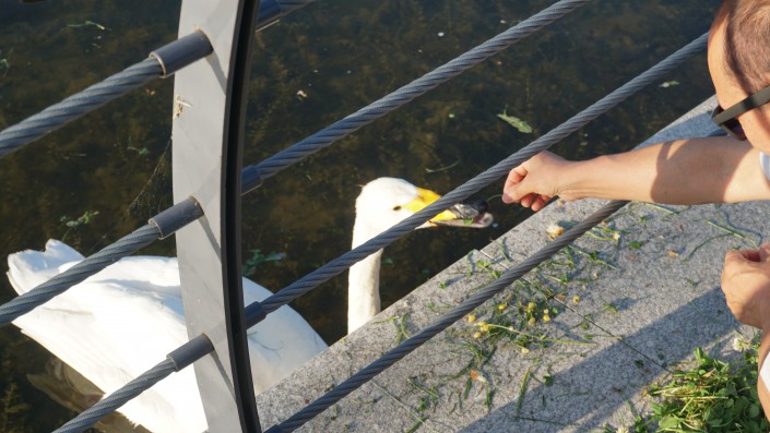 "Клевером", - ответил он. Этот человек приходит сюда почти каждый день и уже давно подкармливает лебедя.