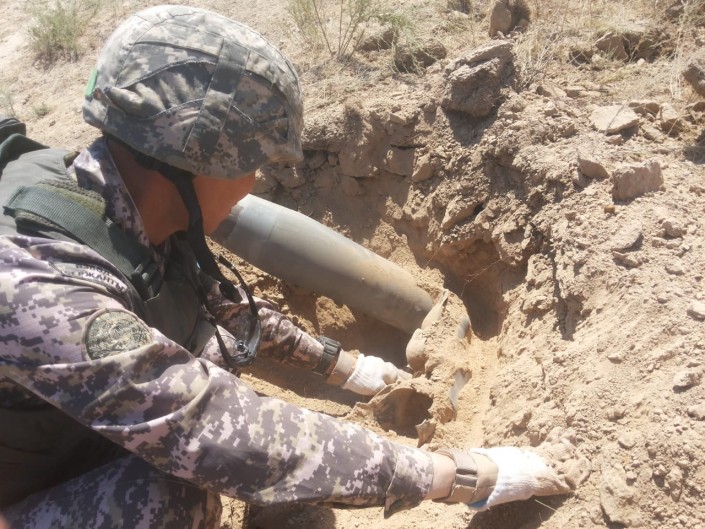За весь период саперами обнаружены и вывезены более 260 тысяч фрагментов боеприпасов, из них взрывоопасных более 180 тысяч фрагментов. Это 70 процентов от общего количества. Все они уничтожены методом подрыва на специально оборудованных подрывных площадках на удалении 60 километров от воинской части, расположенной в Арыси.