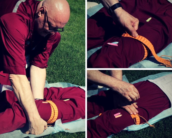 Кровопотери из брюшной полости также опасны для жизни,  поскольку в этой области проходит самый крупный сосуд, из которого исходят все "ветки" артерий. В первую очередь нам необходимо согнуть  ноги пострадавшего и прижать кулаком аорту  к позвоночнику. По ощущениям, конечно, неприятно, но, чтобы не погибнуть, раненому придется потерпеть.