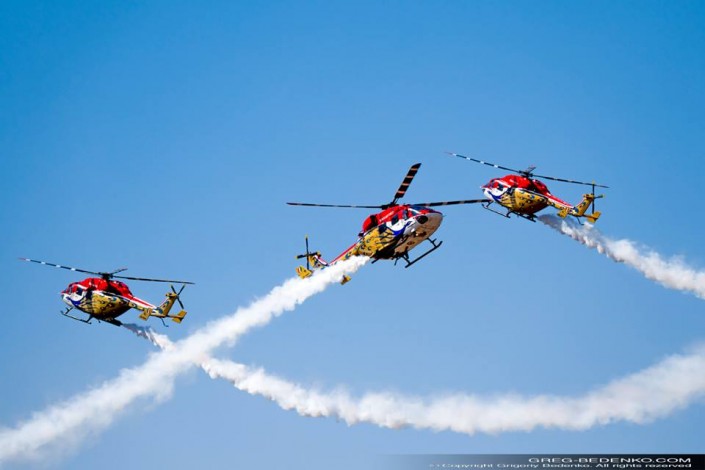 Выступление пилотажной группы Sarang ("Павлин") индийских ВВС на открытии авиасалона в Индии.