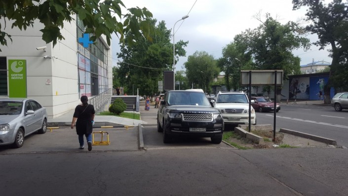 Водитель припарковал свой Volkswagen на тротуаре близ пересечения улиц Манаса и Жамбыла.