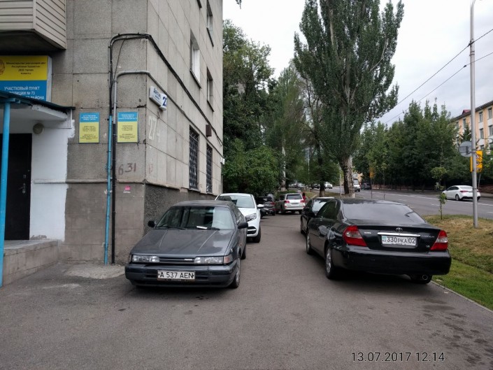 В предыдущих выпусках рубрики мы уже писали о незаконной парковке во дворе этого жилого дома. Примечательно, что водители оставляют свои авто на тротуаре прямо рядом с полицейским участком. Проспект Достык 274
