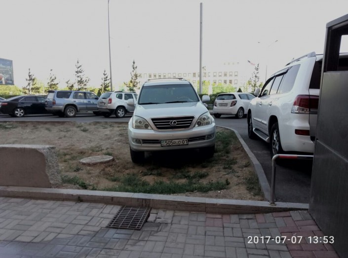 Парковка на газоне. Угол улицы Кошкарбаева и проспекта Тауелсыздык.