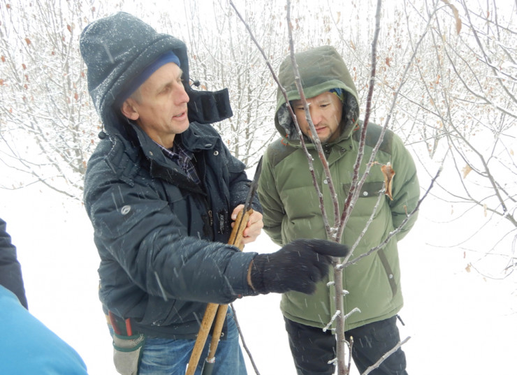 На фото: Патрик Брэди показывает своему коллеге Серикжану, как правильно обрезать деревья