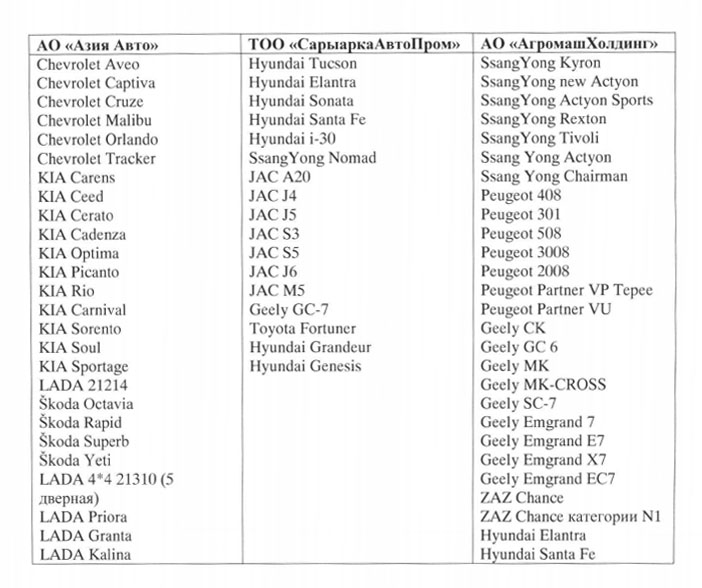 Сейчас по программе льготного автокредитования казахстанцы могут приобрести следующие автомобили: