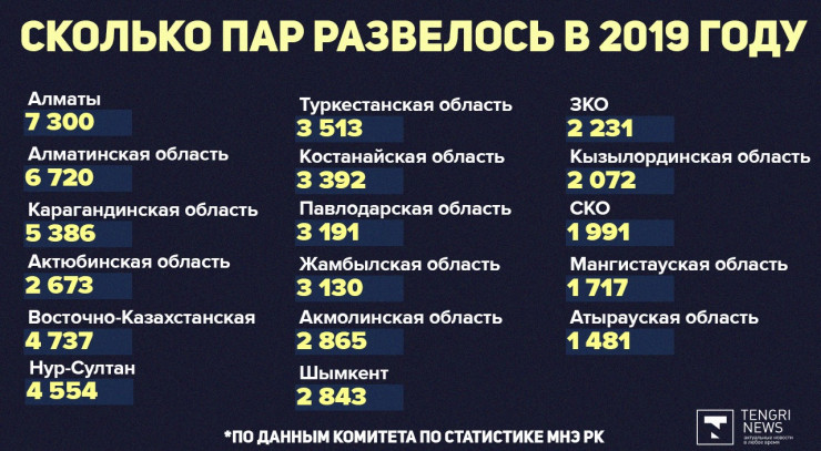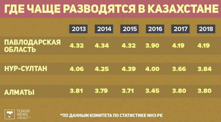 А вот разводятся чаще в Павлодарской области, Нур-Султане и Алматы.
