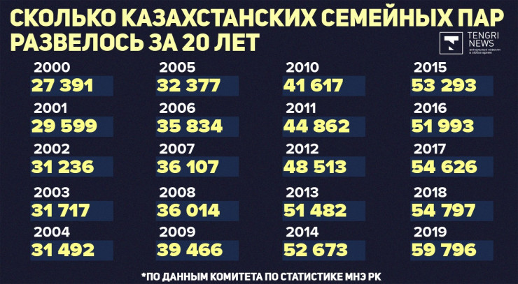 С 2000 по 2019 год распалось 844 885 семей. Если в 2000 году количество разводов достигало 27 391, то в 2019 году эта цифра возросла в два раза, до 54 797.