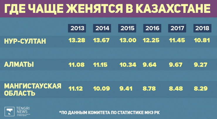 В Казахстане больше женятся в Нур-Султане, Алматы и Мангистауской области. В этих регионах с 2013 по 2018 год самые высокие коэффициенты брачности (он высчитывается как отношение заключенных браков в течение года к среднегодовой численности населения).