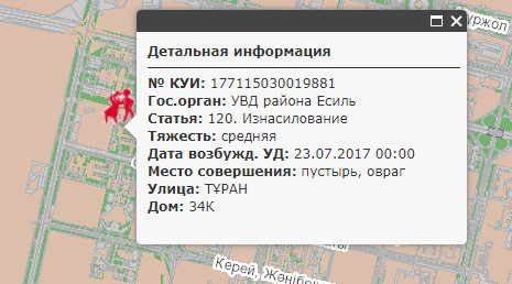 Вообще, если взглянуть на всю Карту уголовных правонарушений, то можно увидеть, что случаи сексуального насилия происходят по всей Астане, включая и пригородные поселки.