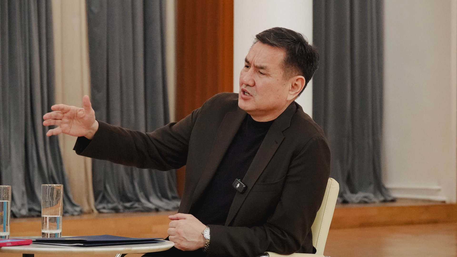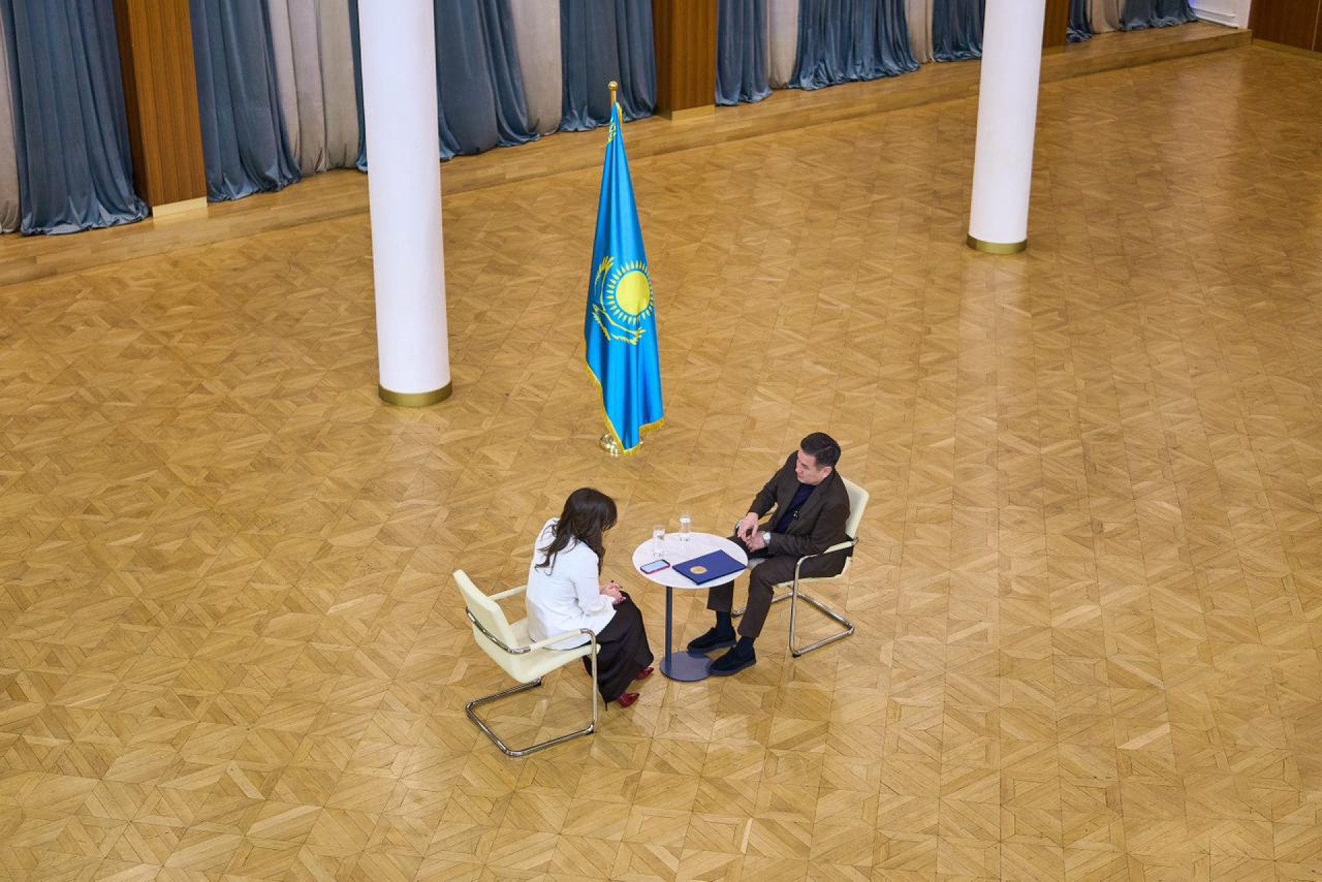 Локацией стал Дом культуры. Пустой огромный зал, два кресла (их привезли специально из акимата) и флаг — так выглядела площадка для нашего разговора.